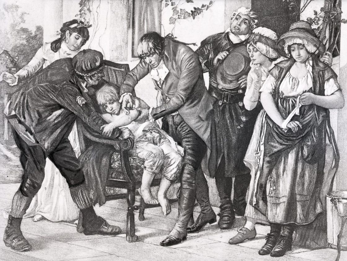 Ảnh: Hình minh họa không ngày tháng, mô tả lần tiêm phòng đầu tiên chống lại bệnh đậu mùa của bác sĩ người Anh Edward Jenner, được James Phipps thực hiện vào năm 1796. Hình ảnh Bettmann / Getty