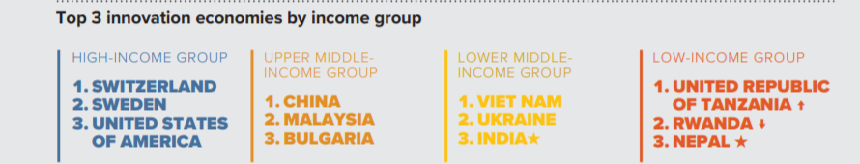 Theo bảng xếp hạng của WIPO, Việt Nam xếp thứ nhất trong nhóm 29 nền kinh tế thu nhập trung bình thấp. So với năm 2019, Việt Nam có chỉ số về các sản phẩm sáng tạo tăng 9 bậc; chỉ số hợp tác viện trường, doanh nghiệp tăng 10 bậc; chỉ số số công bố bài báo khoa học và kĩ thuật tăng 13 bậc; năng lực hấp thụ tri thức tăng 13 bậc. Trong nhóm chỉ số đầu vào tạo thuận lợi cho đổi mới sáng tạo, Việt Nam tiếp tục tăng một