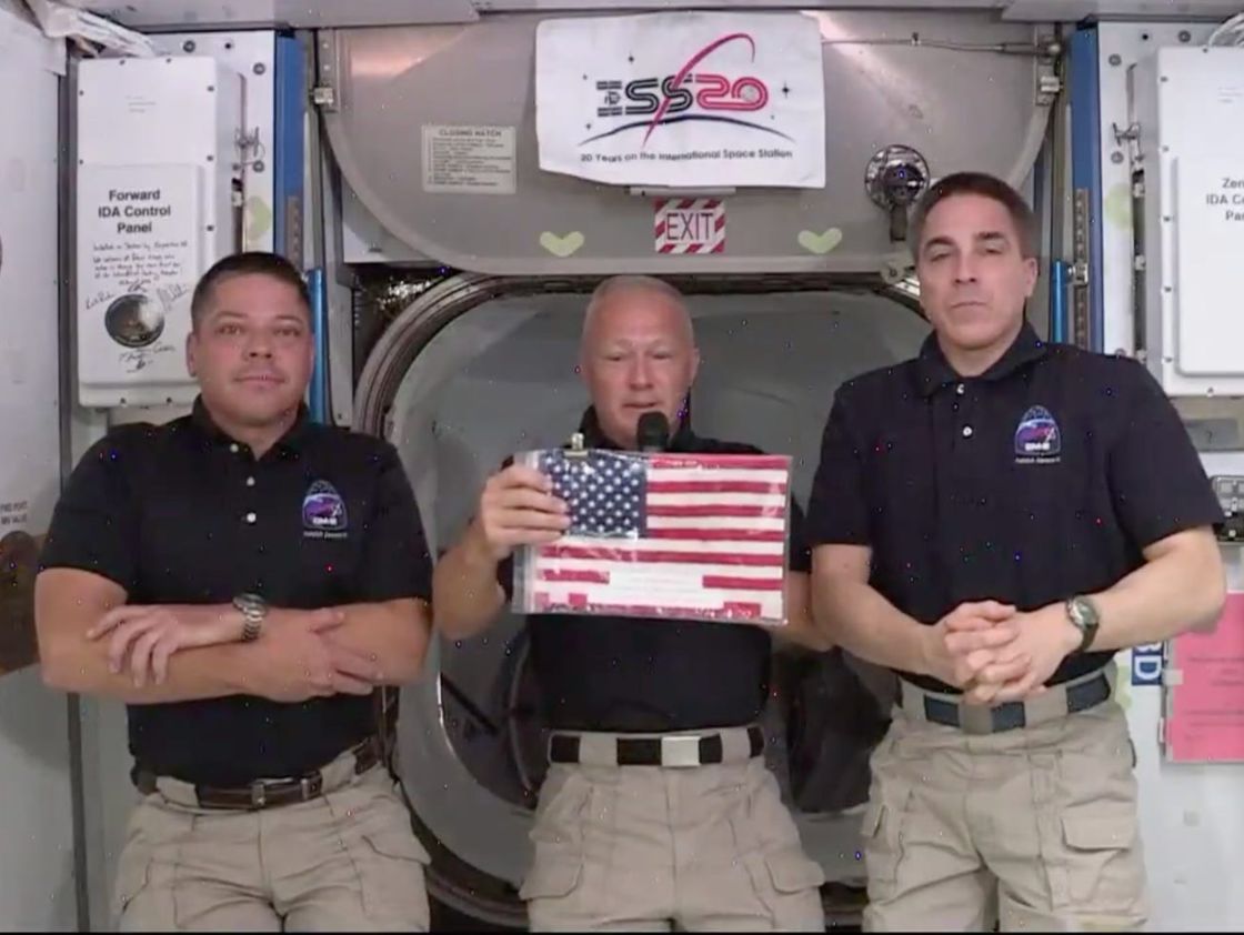 Doug Hurley (giữa) vẫy cờ trong cuộc họp báo với Bob Behnken (trái) và phi hành gia Chris Cassidy (phải) trên Trạm Vũ trụ Quốc tế, ngày 1 tháng 6 năm 2020.