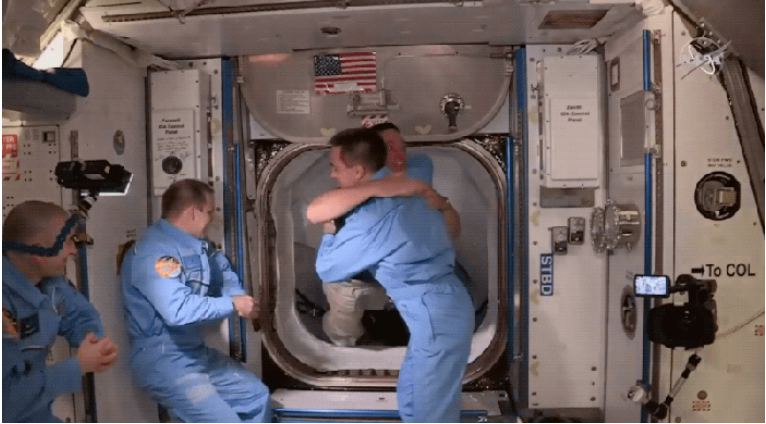 Khi đến nơi, hai phi hành gia đã vẫy một lá cờ Mỹ mà phi hành đoàn tàu con thoi cuối cùng để lại trên ISS. Họ đã đợi 9 năm cho lần đưa người lên vũ trụ tiếp theo của NASA từ đất Mỹ.