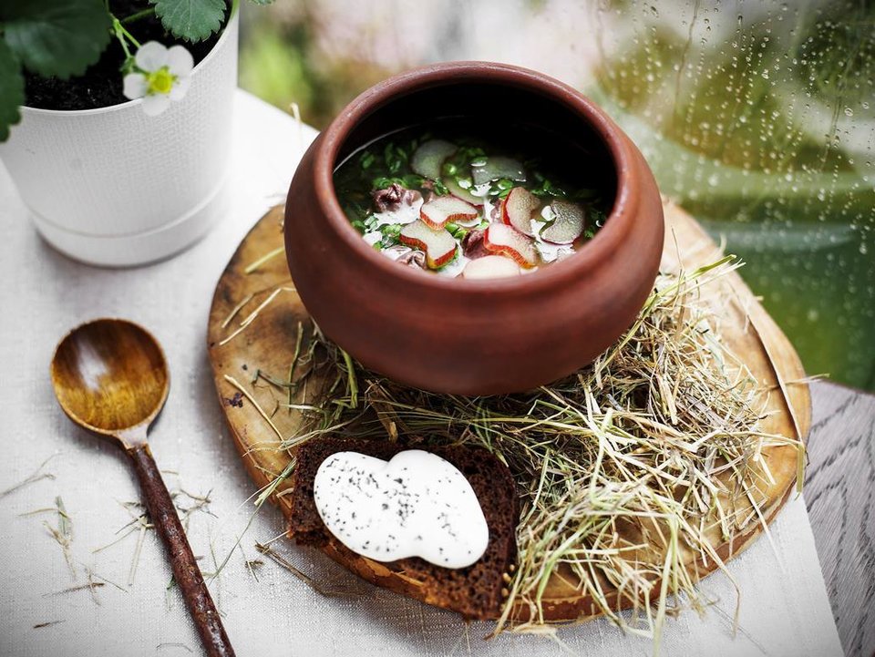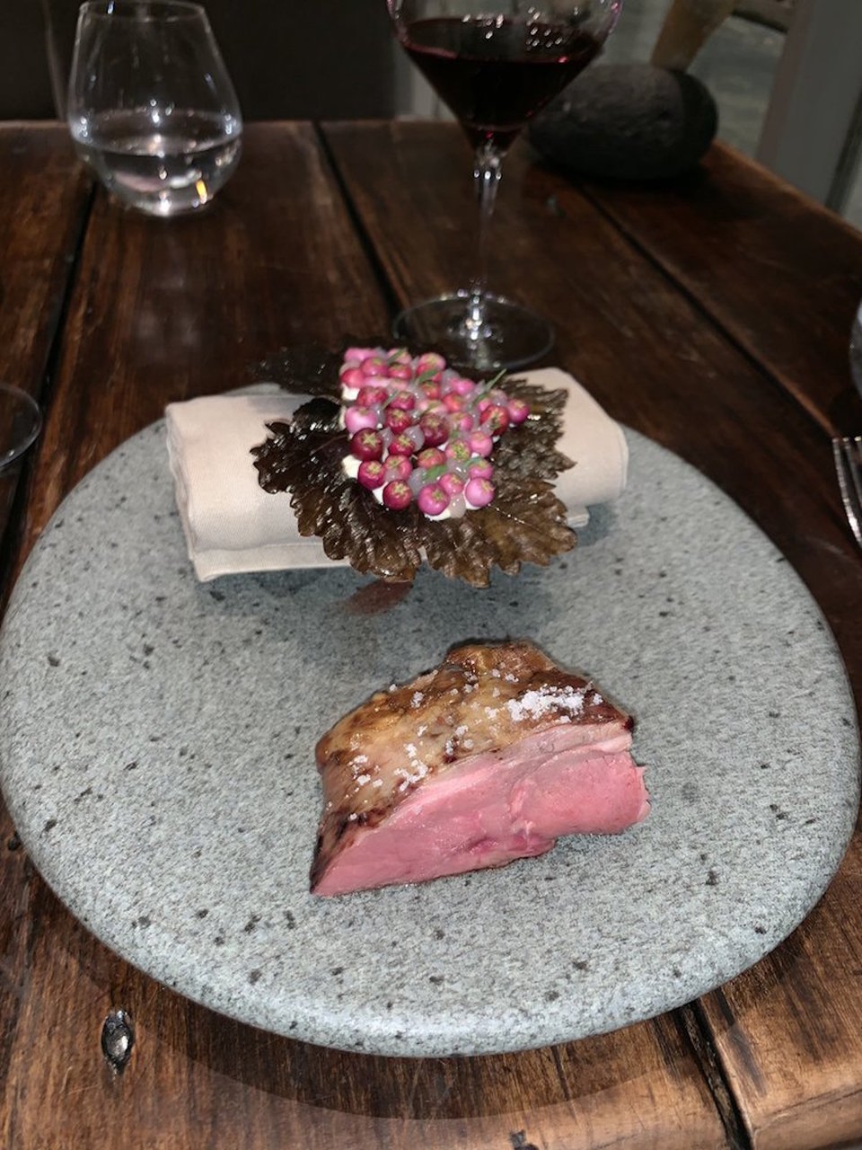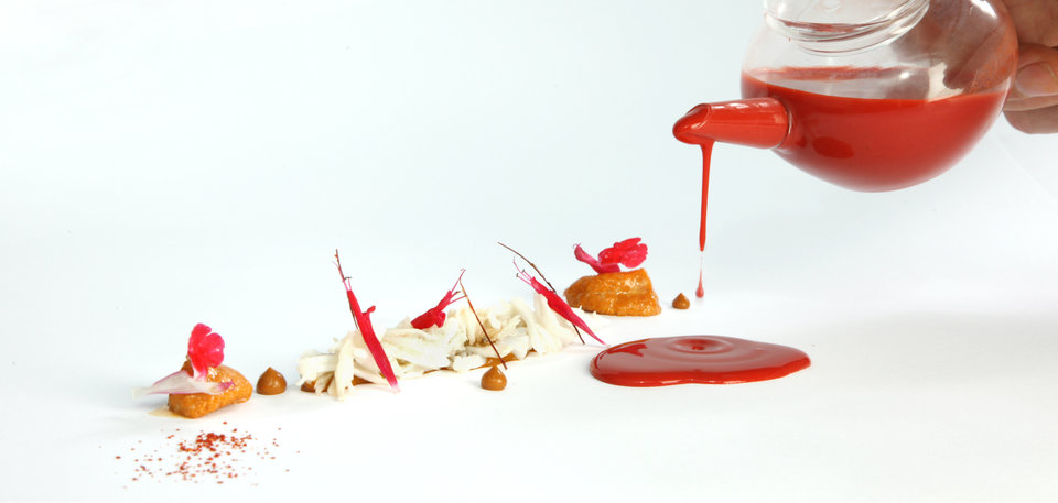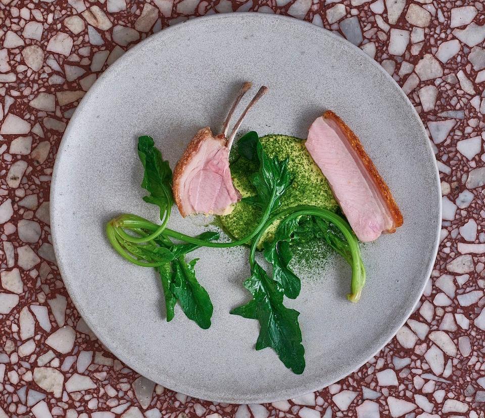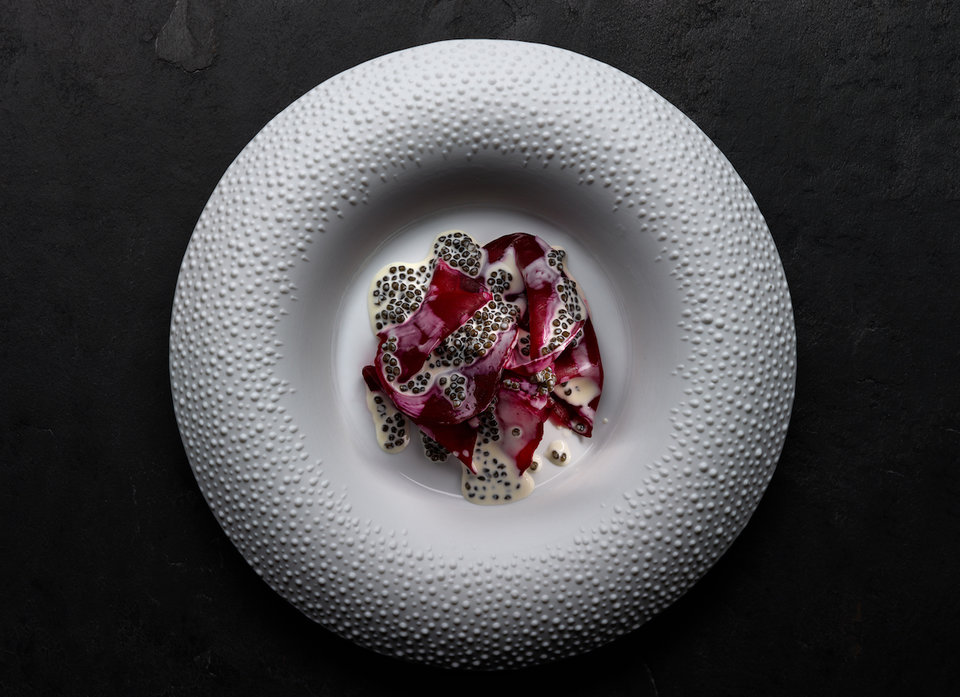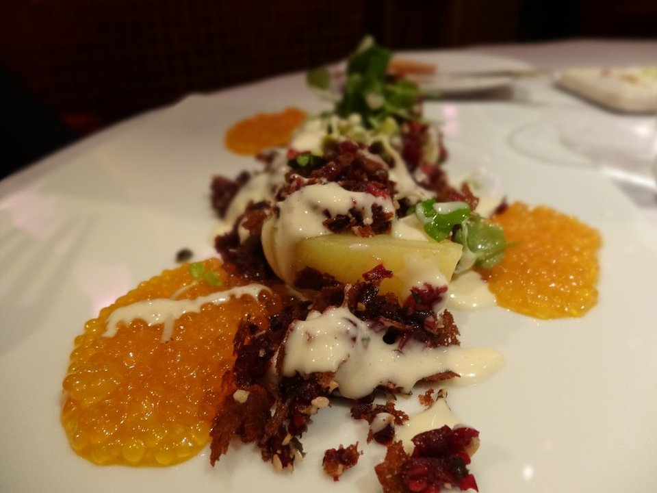 Thiên nhiên và công nghệ là trung tâm là cảm hứng chủ đạo cho thực đơn của bếp trưởng Rasmus Kofoed: 17 món ăn đầy cảm hứng, những "tác phẩm" nghệ thuật bao gồm các thành phần Scandinavia bổ dưỡng và hoang dã. Bạn có thể lầm tưởng đó là những chiếc lá mỏng manh nhưng thực ra chúng được làm từ một cây atisô Jerusalem. Hoặc những gì trông giống như dao cạo râu thực ra lại là bột được vẽ bằng mực.