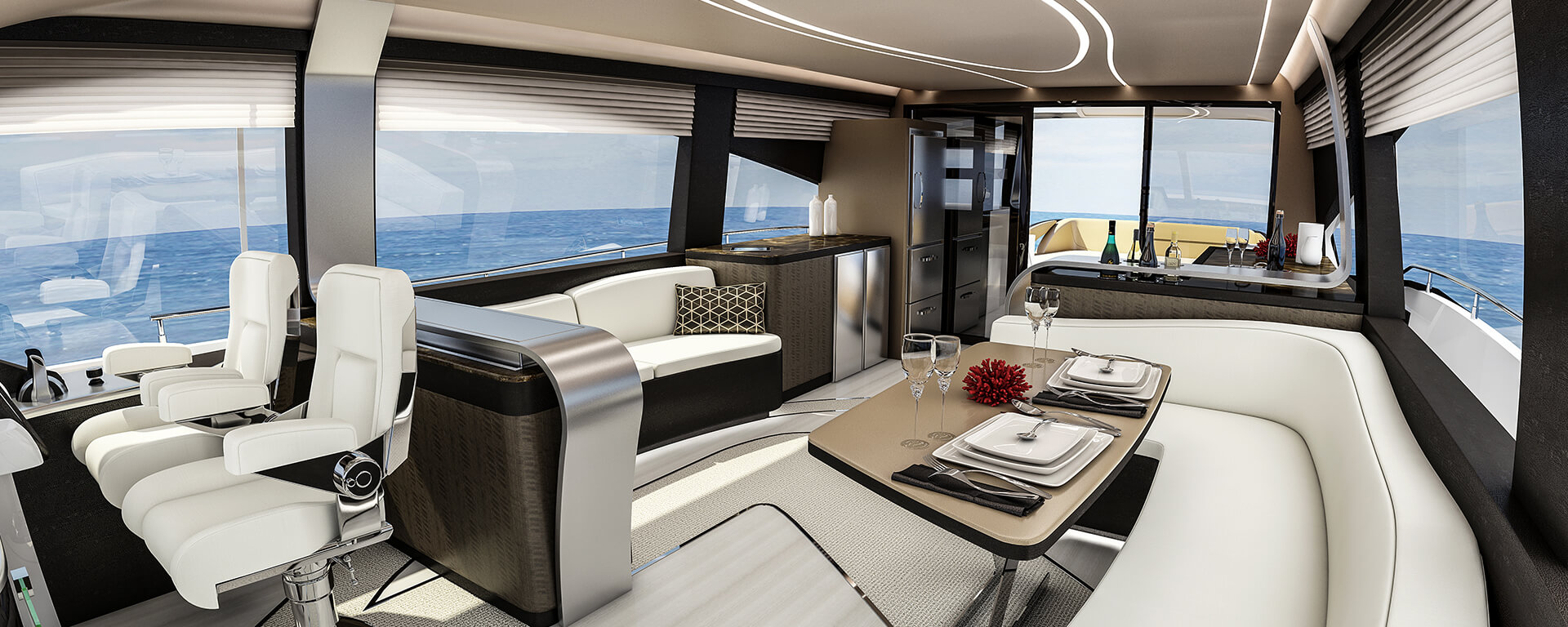 Nhìn từ bên ngoài, đường viền tinh tế của chiếc du thuyền Lexus kéo dài nhô cao hướng về phía trước trong khi hai hai bên mở rộng ra phía sau.