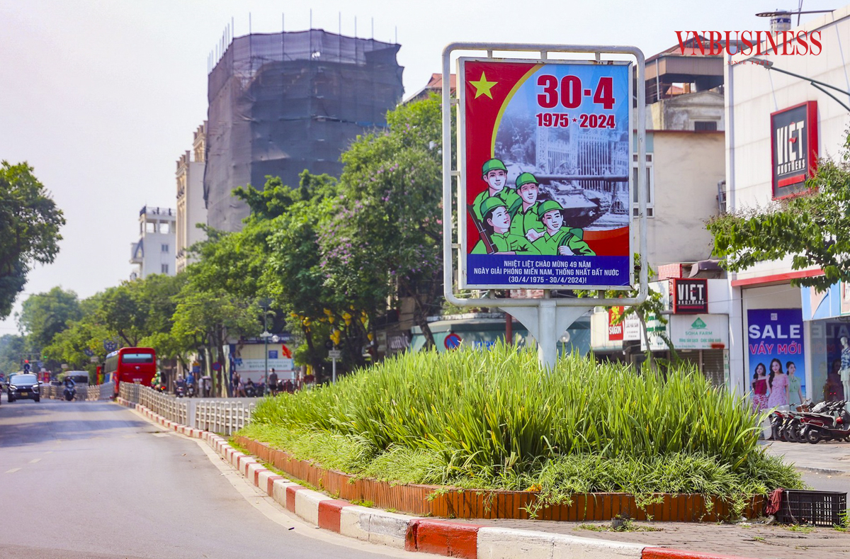 Kỷ niệm 49 năm ngày Giải phóng miền Nam thống nhất đất nước, 70 năm Chiến thắng Điện Biên Phủ và 138 năm Ngày Quốc tế Lao động, nhiều tuyến phố của Thủ đô Hà Nội đã được trang hoàng rực rỡ cờ hoa, băng rôn, khẩu hiệu...