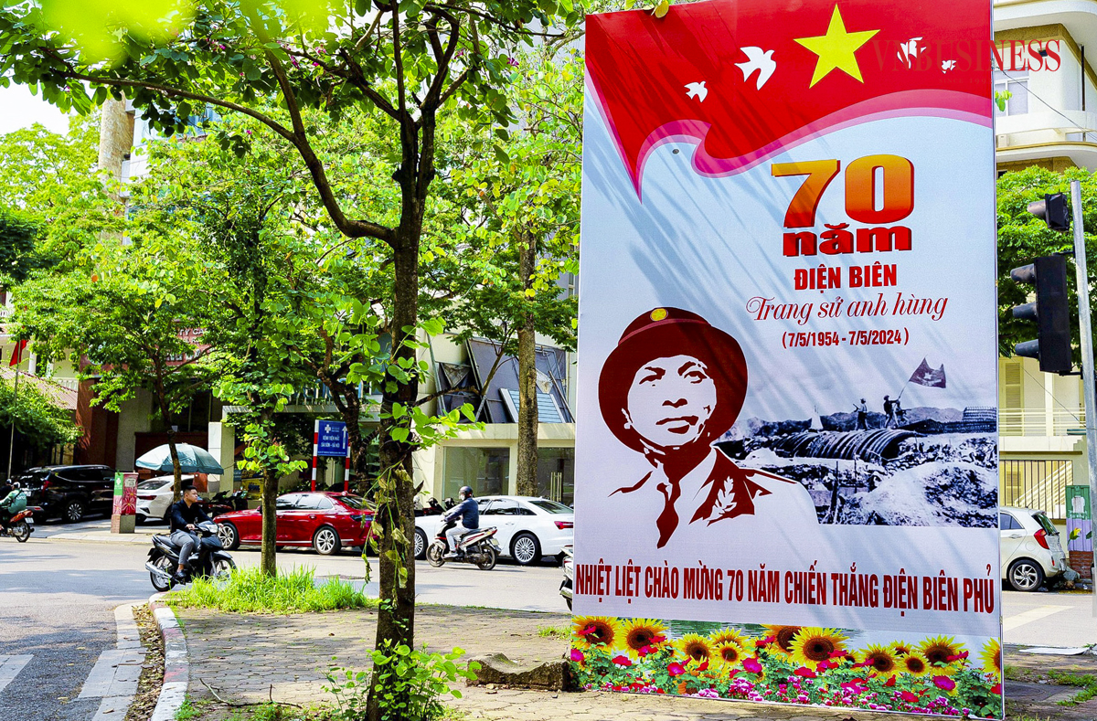 Trên phố Nguyễn Du, một tấm áp phích cỡ lớn được dựng lên với khẩu hiệu "70 năm Điện Biên trang sử anh hùng (7/5/1954 - 7/5/2024)".
