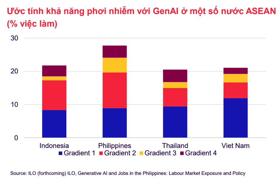 Theo nghiên cứu của ILO về tác động của Gen AI đến việc làm ở ASEAN, so với các nước trong khu vực, việc làm ở Việt Nam có tiềm năng tiếp xúc với AI tương tự như Thái Lan và Indonesia. Việt Nam có tỷ lệ người lao động có nguy cơ Gradient 4 thấp hơn so với Indonesia, Philippines và Thái Lan.