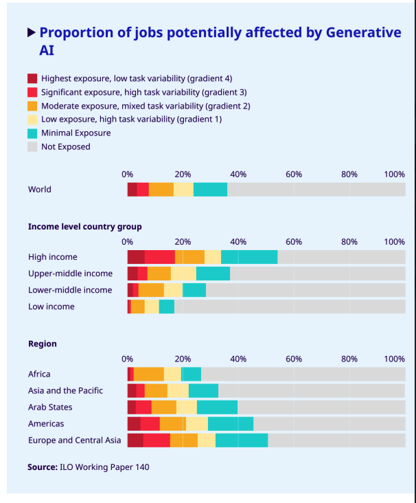 Trên toàn cầu, cứ 4 người lao động làm nghề thì có 1 người có mức độ tiếp xúc nhất định với GenAI (AI tạo sinh). 3,3% việc làm toàn cầu thuộc nhóm Gradient 4 - nhóm phơi nhiễm cao nhất, khả năng thay đổi công việc thấp. Đặc biệt, các công việc hành chính - văn phòng có mức độ phơi nhiễm cao nhất. Điều này khiến phụ nữ dễ bị tác động do họ chiếm tỷ lệ cao trong các nhóm nghề này.