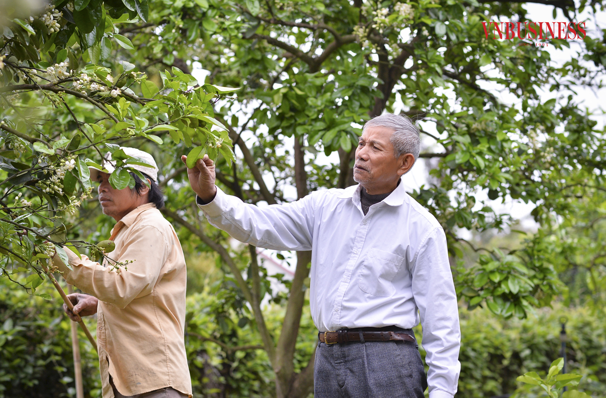 Ông Lê Hữu Diện (áo trắng), Giám đốc HTX Nông nghiệp sạch Đức hậu Lưu Quang cho biết, nếu để cây bưởi phát triển tự nhiên thì tỷ lệ đậu quả chỉ đạt không quá 60%. Việc thụ phấn bằng tay sẽ cho tỷ lệ đậu quả đạt trên 90%.