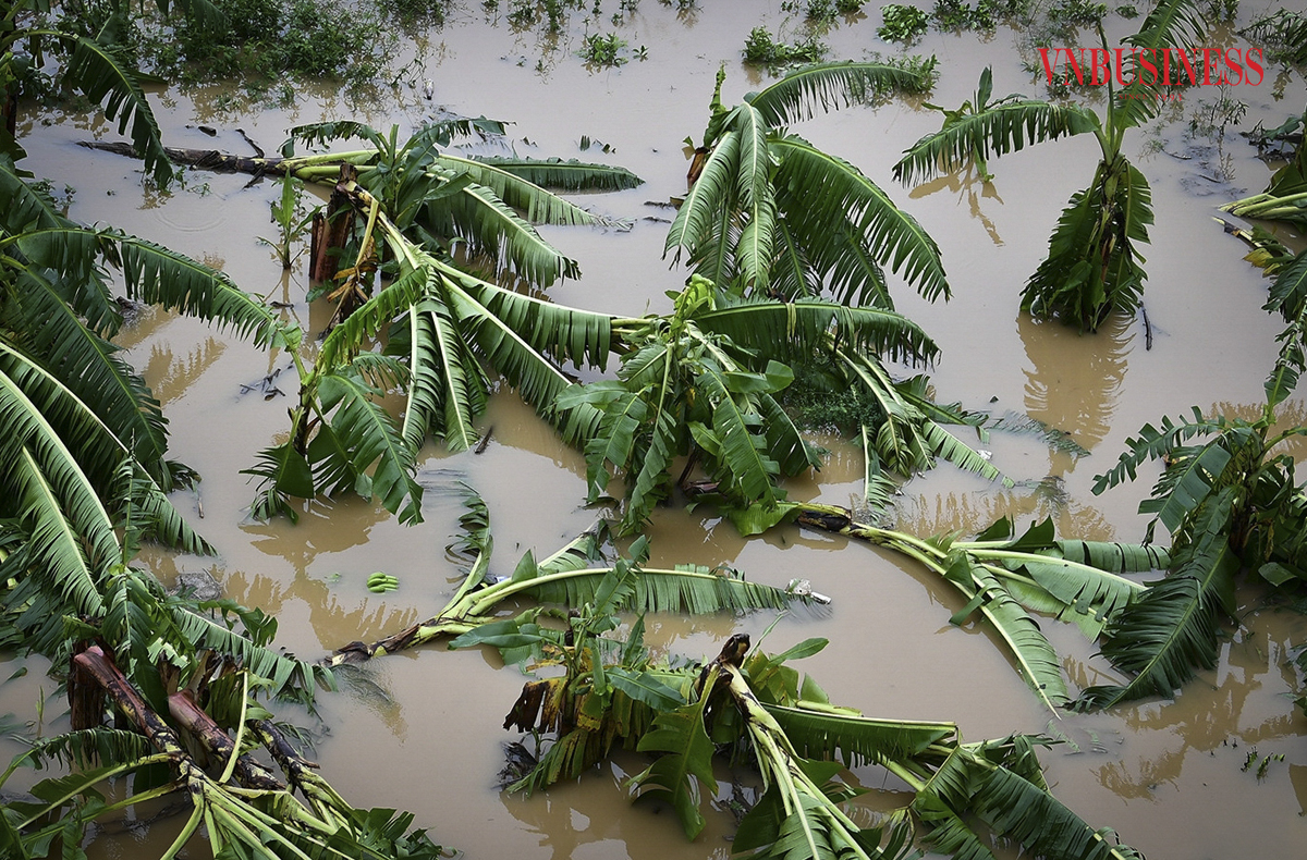 Bãi giữa sông Hồng cũng là nơi người dân trồng nhiều loại cây ăn quả, rau màu, tất cả bị gãy dập và chìm sâu trong nước.