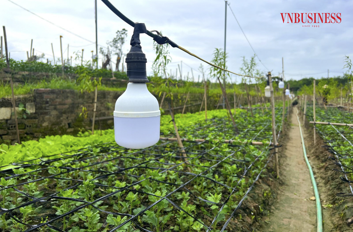 Những luống hoa cúc xanh tốt đan xen giữa những cây đào Nhật Tân. Người dân phải dùng bóng đèn điện thắp xuyên đêm để kích thích hoa mọc nhanh hơn.