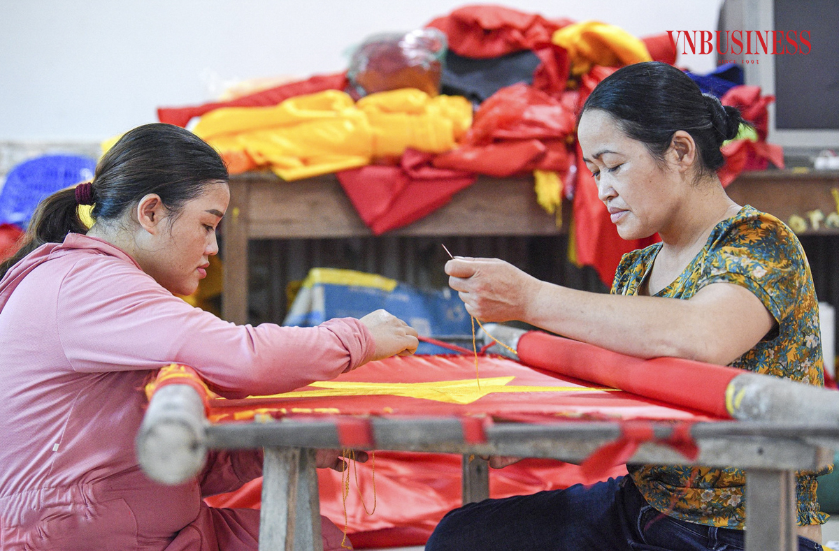 Cứ mỗi dịp cận kề các ngày lễ lớn của đất nước, các xưởng may trong làng lại đỏ rực sắc cờ. Tiếng máy khâu rộn ràng, nhịp tay thợ thoăn thoắt, không khí sản xuất nhộn nhịp suốt ngày đêm để kịp cung ứng những lá cờ Tổ quốc tung bay khắp mọi miền đất nước.