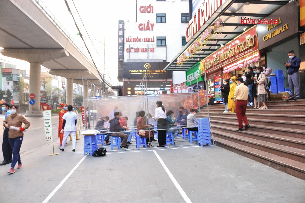 6h30 sáng tại một cơ sở bán vàng ở Cầu Giấy, người dân xếp hàng, khai báo y tế để mua vàng cầu may.