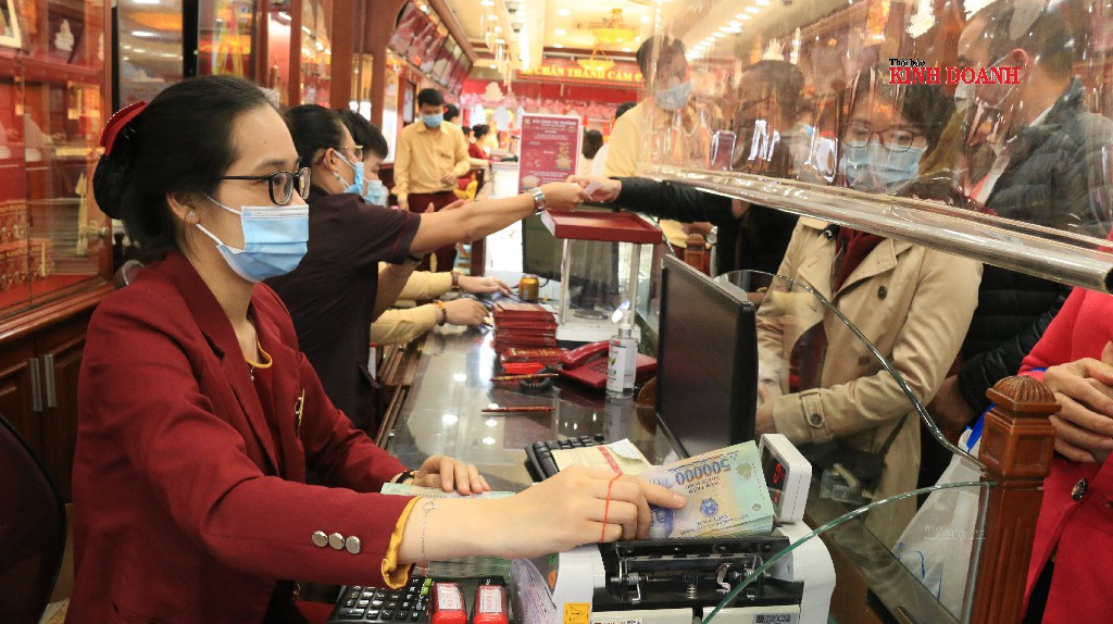 Giao dịch giữa nhân viên cửa hàng và khách hàng được ngăn cách bởi tấm kính, màn chắn an toàn. Nhiều người dân còn tận dụng giá vàng lên đỉnh, bán vàng kiếm lời.