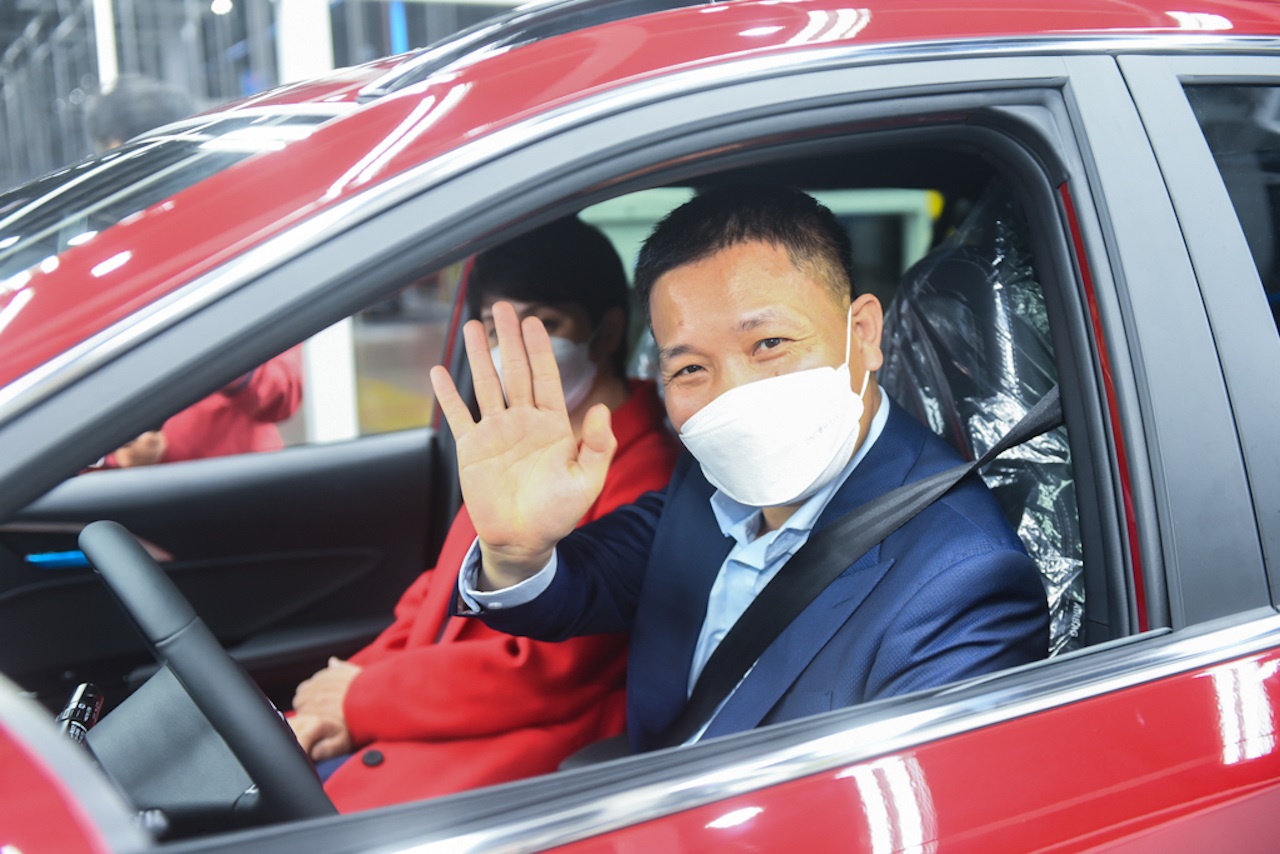 Đúng 11 giờ 30 phút, những chiếc VinFast VF e34 đầu tiên chính thức lăn bánh khỏi dây chuyền sản xuất trong tiếng vỗ tay và sự chào đón của mọi người.