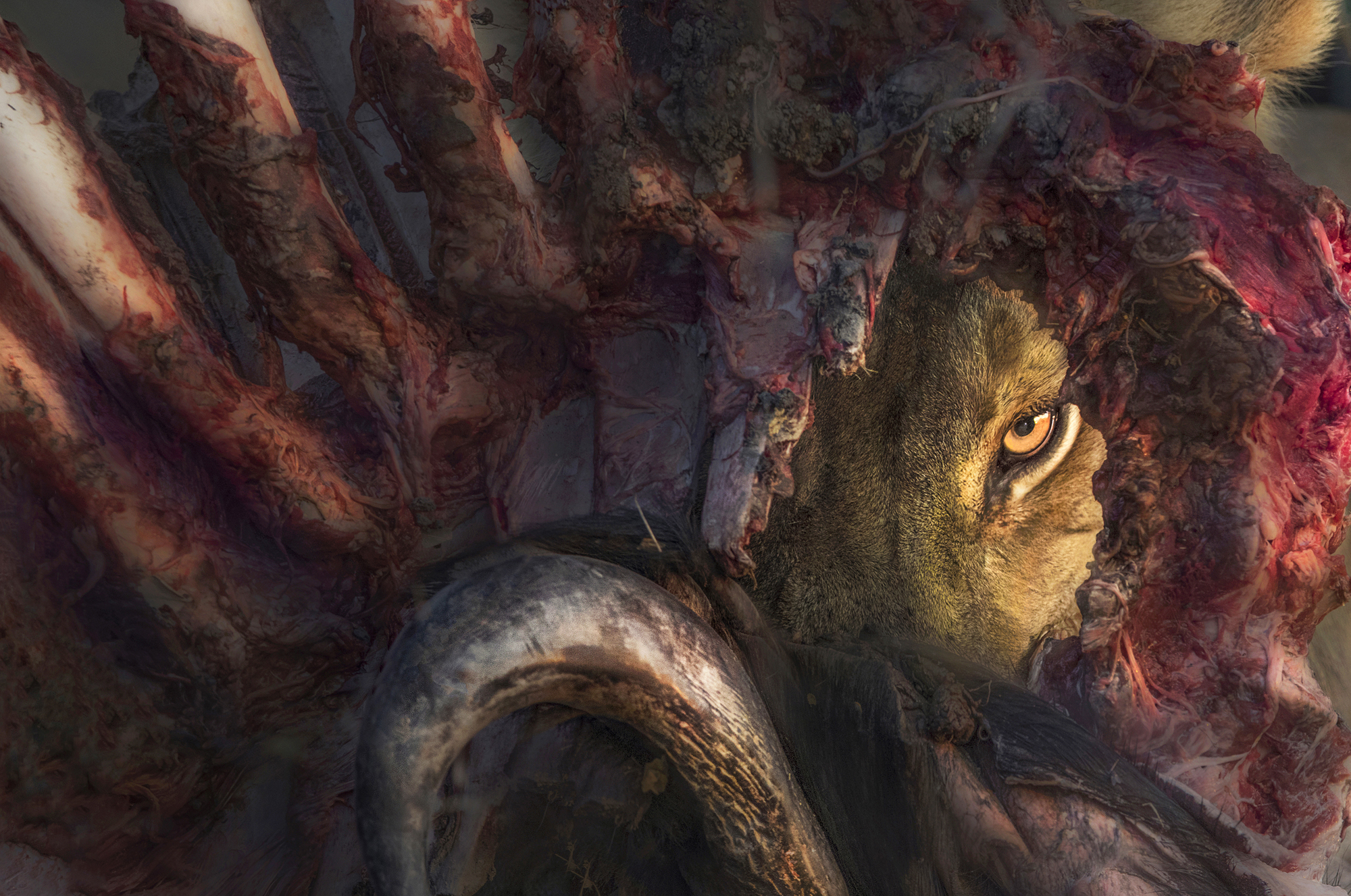 Chú thích: Một con sư tử đực to lớn nhìn qua xác một con trâu bị giết ngày hôm trước.