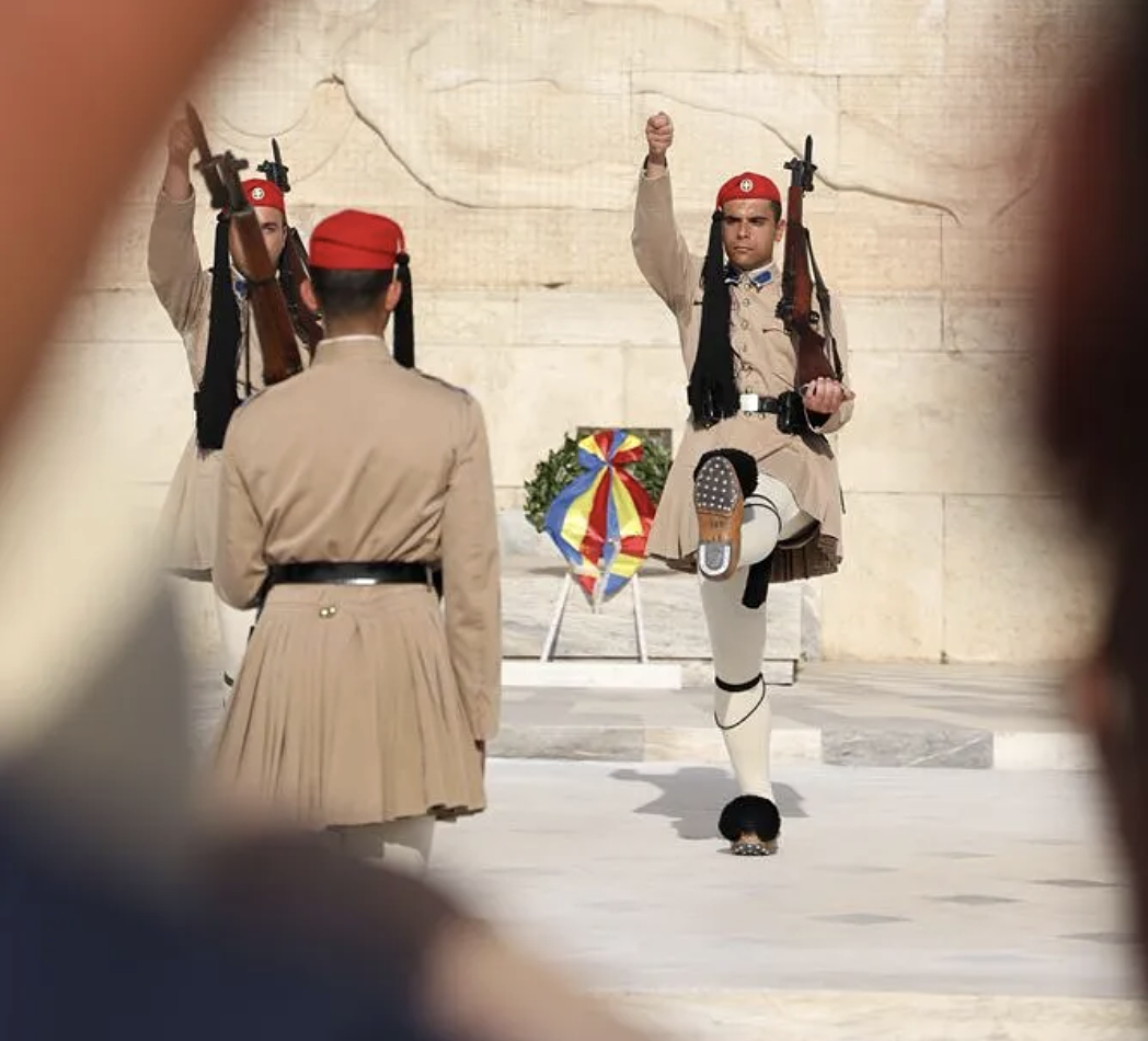 Chú thích: Một trong những người lính Evzones bắt đầu ca làm việc của mình trước Ngôi mộ Chiến sĩ Vô danh ở Hy Lạp. Đối với hình ảnh cụ thể này, tác giả muốn ghi lại tính ẩn danh và tính đồng nhất mà tất cả các Evzone đều có.