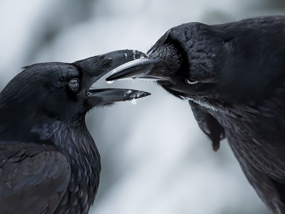 Đó là giữa mùa đông, bắt đầu mùa sinh sản của quạ. Shane nằm xuống nền đất đóng băng, sử dụng ánh sáng dịu để ghi lại các chi tiết của bộ lông óng ánh của quạ tương phản với tuyết để làm nổi bật khoảnh khắc thân mật nơi cặp mỏ đen dày của chúng kết hợp với nhau.