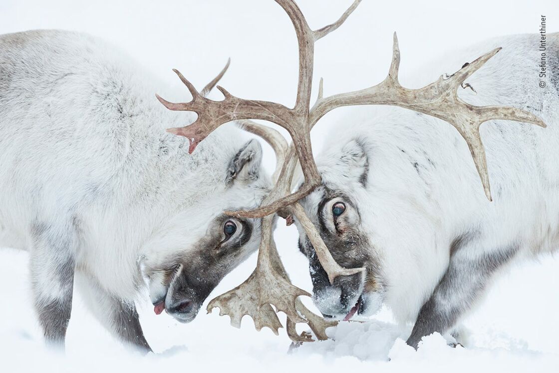 Nhiếp ảnh gia Stephano Unterthiner (Ý) chứng kiến cảnh hai con tuần lộc ở quần đảo Svalbard của Na Uy chiến đấu để giành quyền kiểm soát "hậu cung". Tác phẩm "Đối đầu" đã giúp Stefano Unterthiner chiến thắng ở hạng mục Hành vi của động vật có vú.