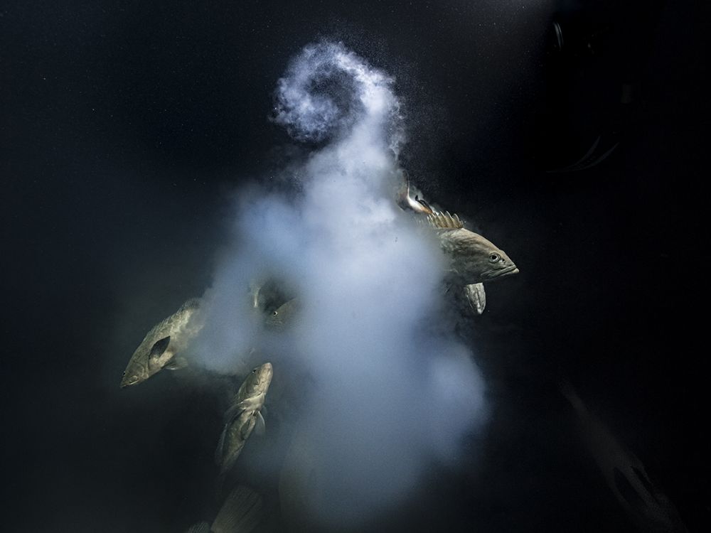 Dân số cá mú ngụy trang đang giảm do bị đánh bắt quá mức, nhưng cứ vào rằm tháng bảy, cá bắt đầu sinh sôi. Trong 5 năm qua, nhà sinh vật học Laurent Ballesta đã trở lại đầm phá ở Fakarava, Polynesia thuộc Pháp, để chụp ảnh cá mú sinh sản vào mỗi mùa hè.