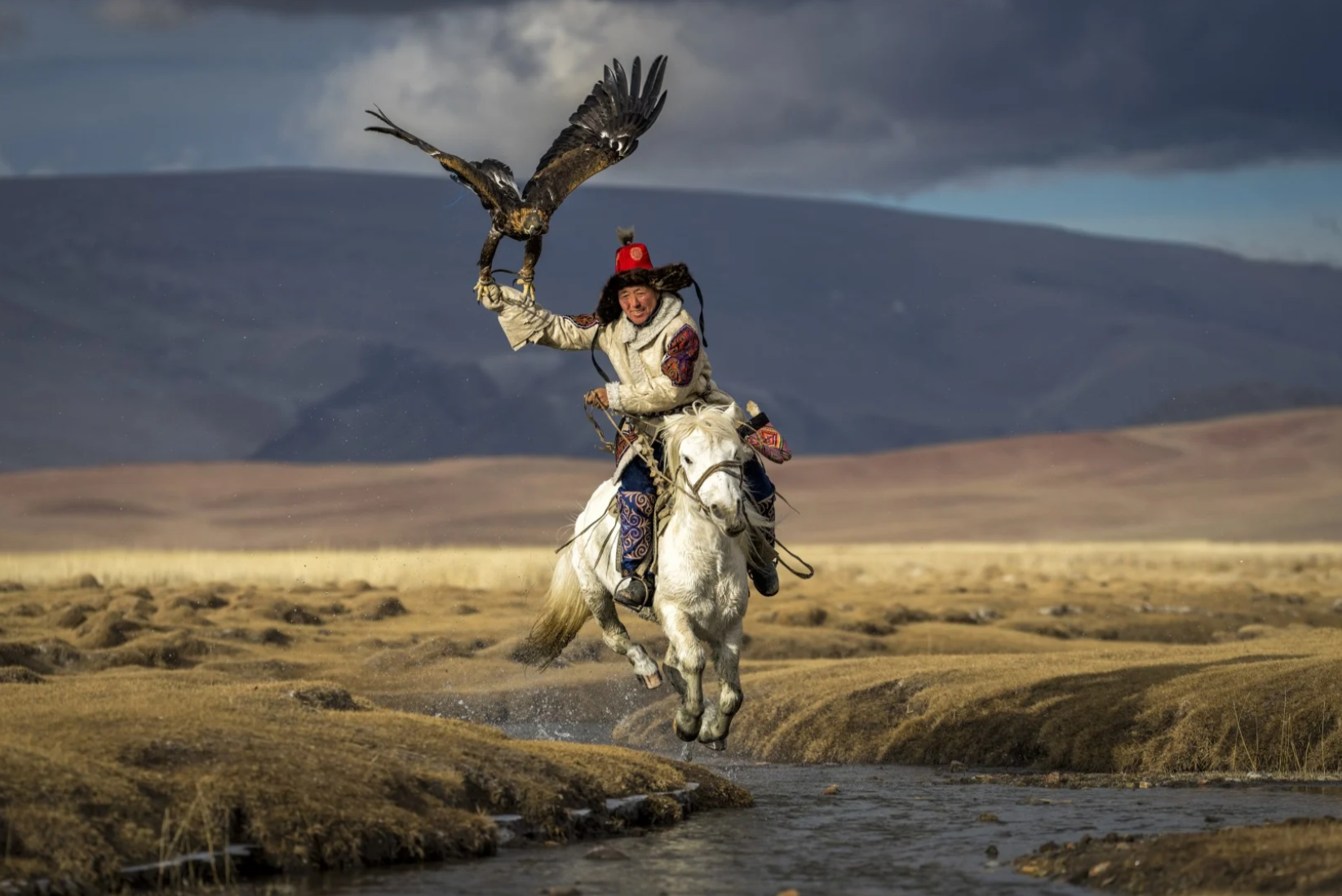 Thợ săn và con đại bàng cưỡi ngựa trên đồng cỏ Bayan-Olgii, Mông Cổ.