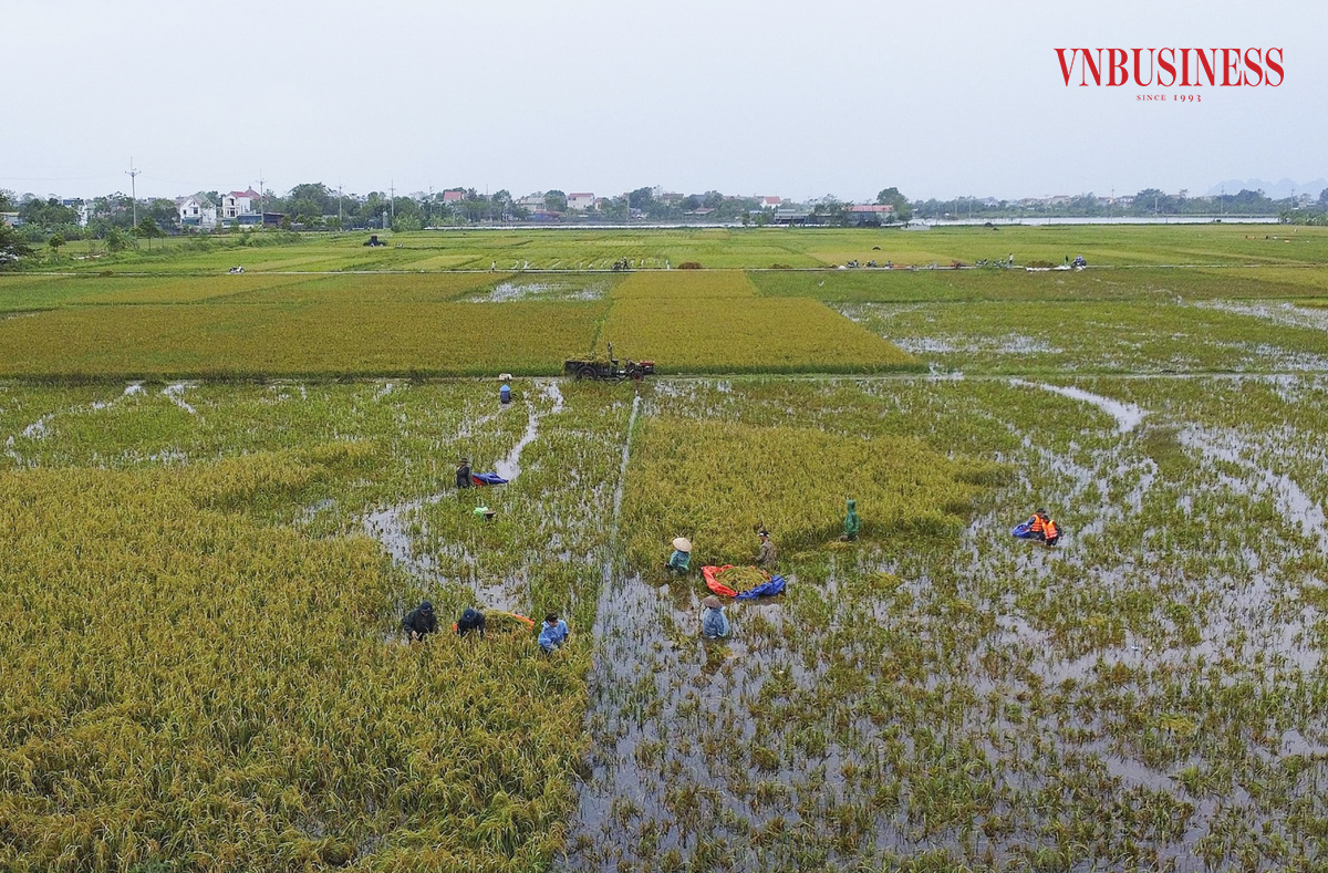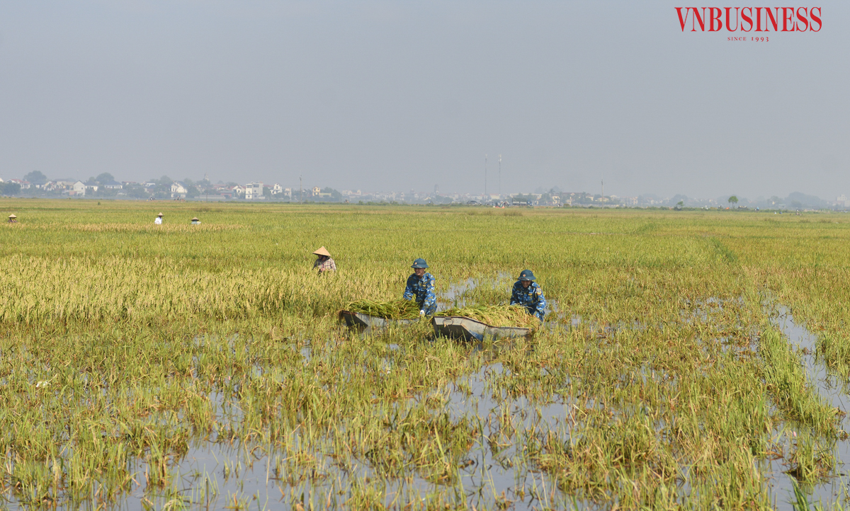 Nước ngập sâu và bùn lầy lội, khiến việc thu hoạch lúa gặp rất nhiều khó khăn, phải sử dụng thuyền tôn để vận chuyển vào bờ.