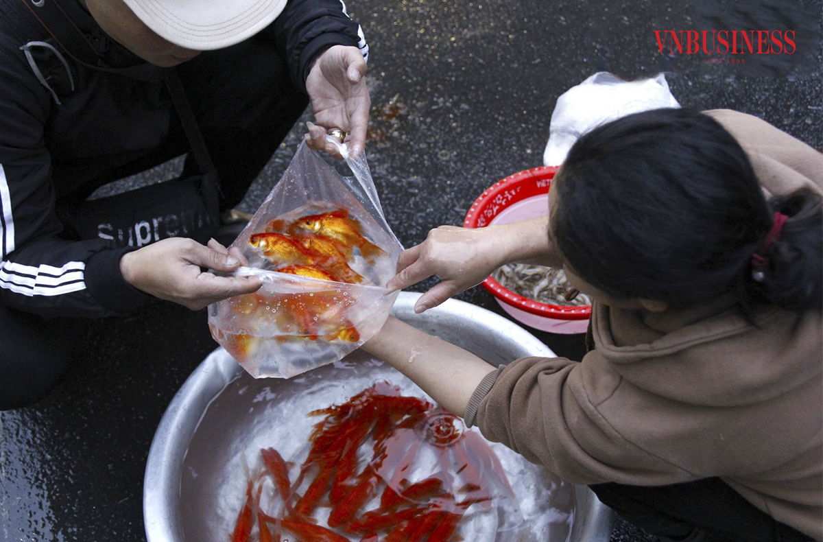 Cá vàng cũng là món đồ lễ không thể thiếu trong ngày "tiễn ông Công, ông Táo về trời", giá cá vàng năm nay có phần nhỉnh hơn mọi năm do ảnh hưởng của cơn bão số 3 hồi tháng 9.